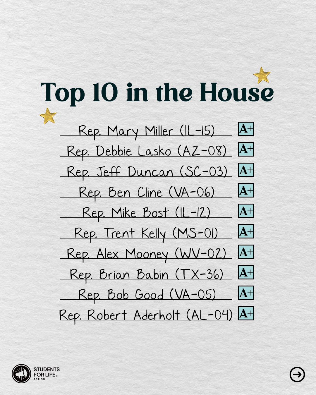 “As we said last year, we are not looking to award participation trophies,” said SFLAction President Kristan Hawkins. “To earn top marks in this Congressional class, legislators’ vision matters, as seen in the legislation introduced and co-sponsored. There are not many straight up-and-down votes to protect and defend pre-born infants and their mothers, which is why we did not limit our analysis to a handful of votes. But in the vision offered by legislative goals, a governing plan for the future emerges. Our commitment to encouraging and demanding a pro-life vision for America can be seen as well in our GOP for Life campaign currently underway, calling on Republican leadership across the country to maintain and defend a pro-life vision in the GOP party platform. Pro-life voters are asking more from their political leadership than a throwaway line.”