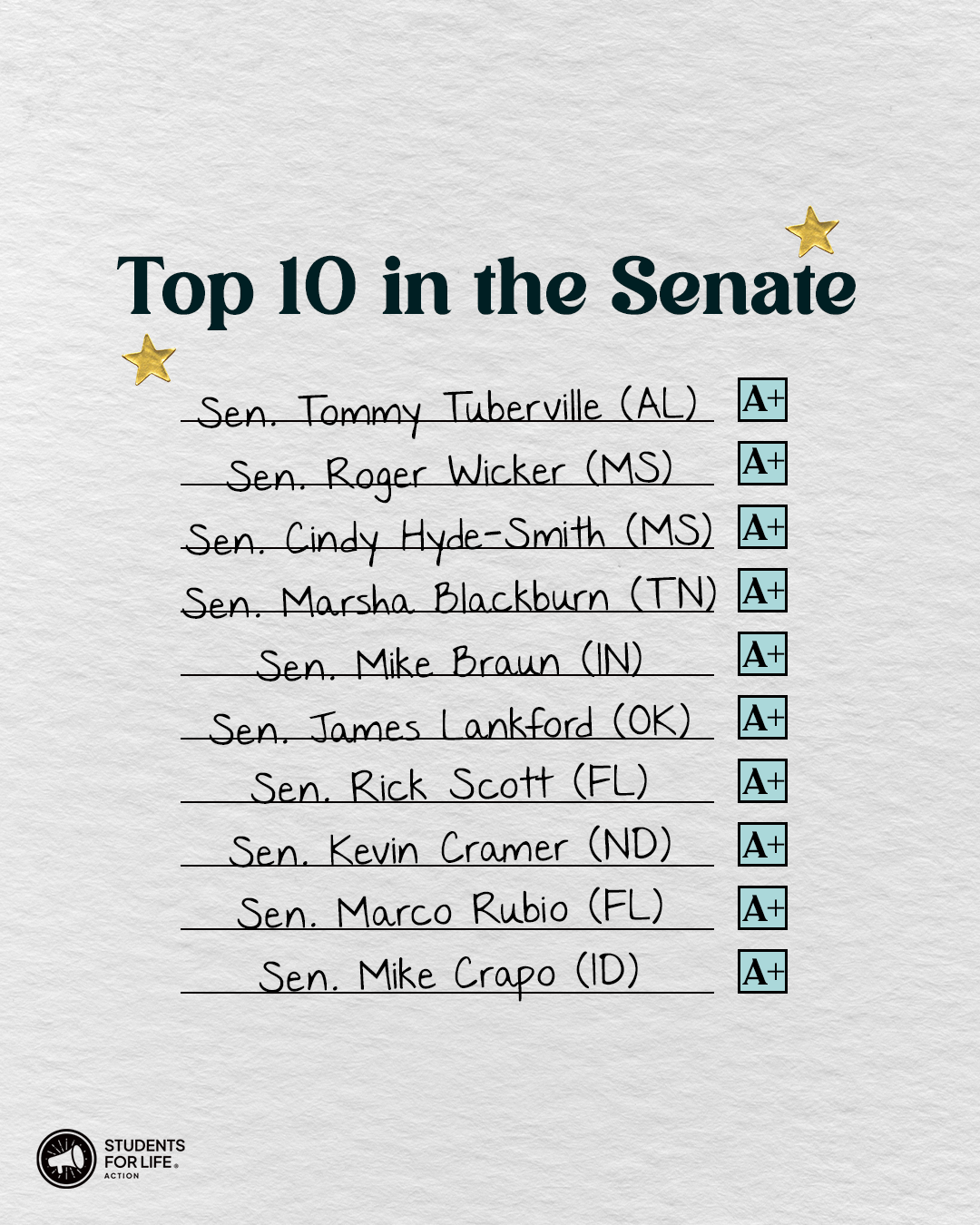 - Five senators who stood against Tommy Tuberville’s principled stand for Life, Todd Young (IN), Joni Ernst (IA), Mitt Romney (UT), Dan Sullivan (AK), and Lindsey Graham (SC), all received C’s