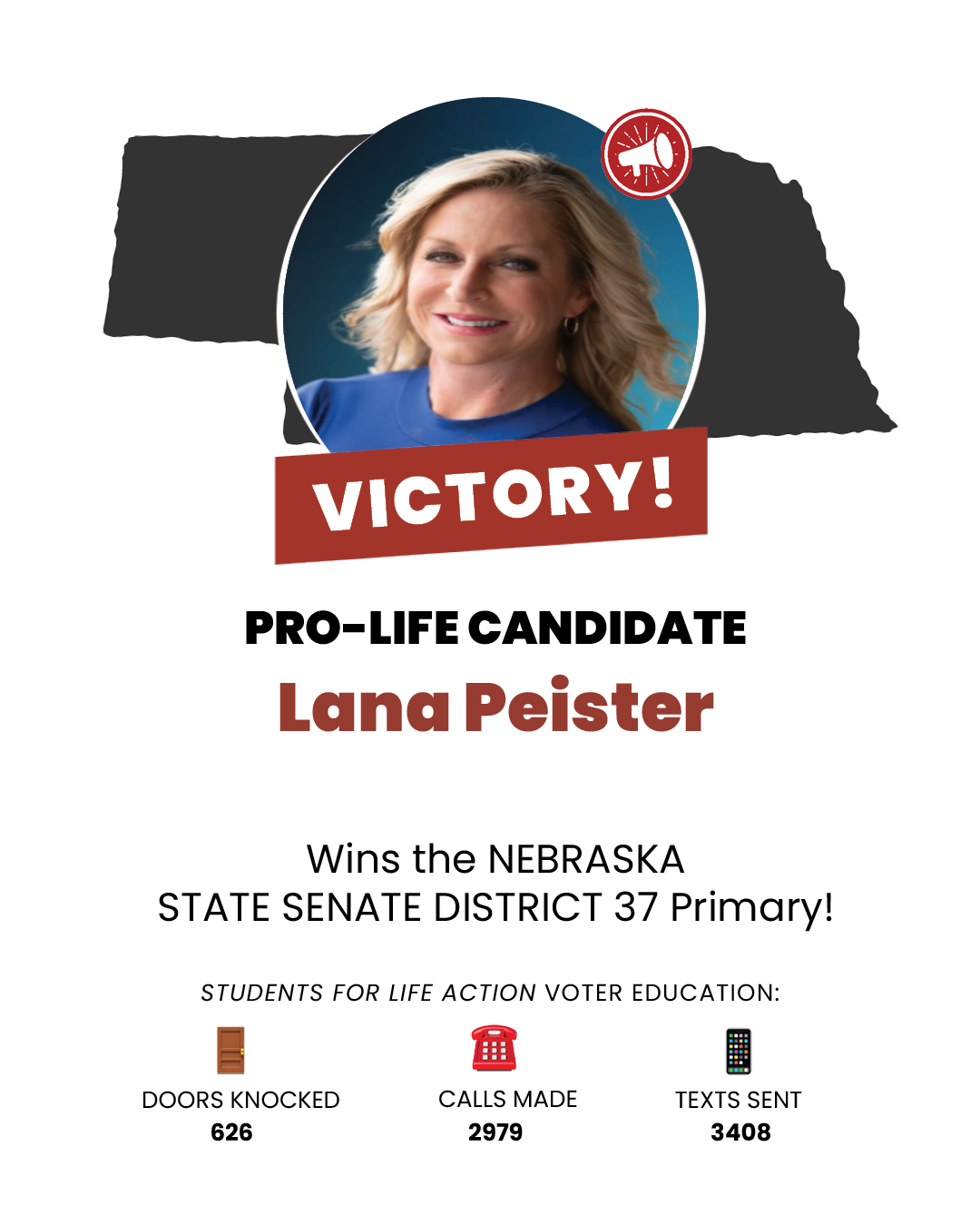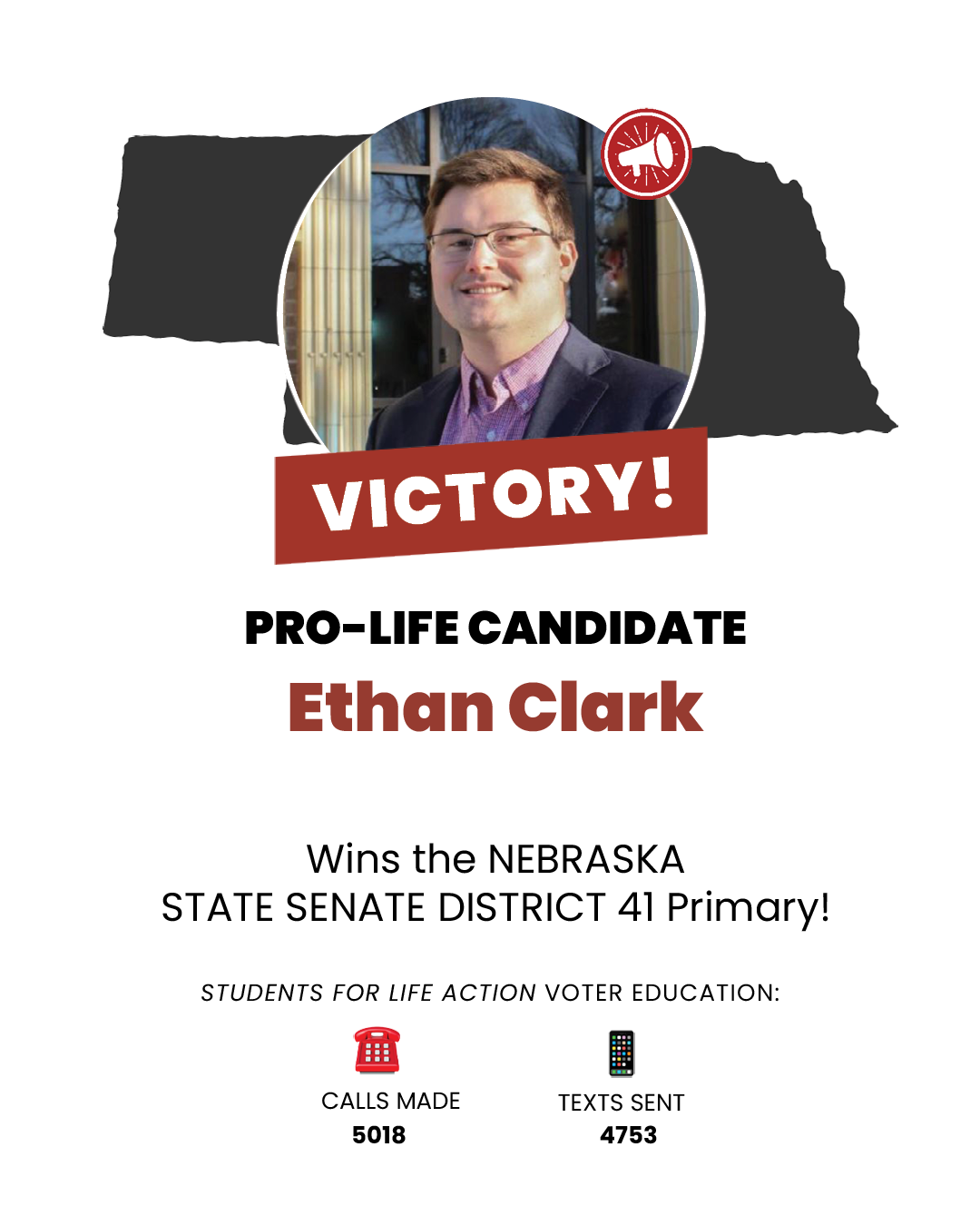 OMAHA, N.E. (05-14-2024) – Students for Life Action (SFLAction) celebrates the primary wins of TWO new pro-life leaders in Nebraska after tonight’s State Senate primary races. SFLAction Vice President of Political Affairs Chanel Prunier said, “Nebraska is a major battleground for Students for Life Action in our fight on behalf of the preborn lives, and in this race we are working to defeat weak, pro-abortion Republicans like Senator Merv Riepe. We’re grateful to see these Students for Life Action supported pro-life champions advance to the general election. Nebraska voters made it clear that they will not tolerate candidates who turn their backs on the preborn and ignore the human rights issue of our day.”