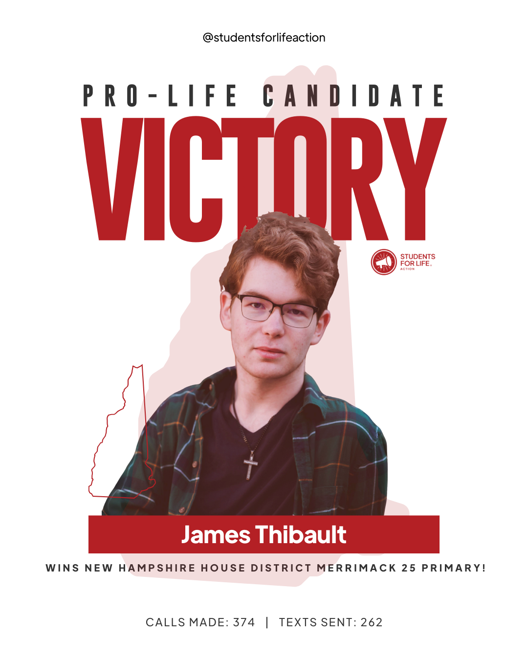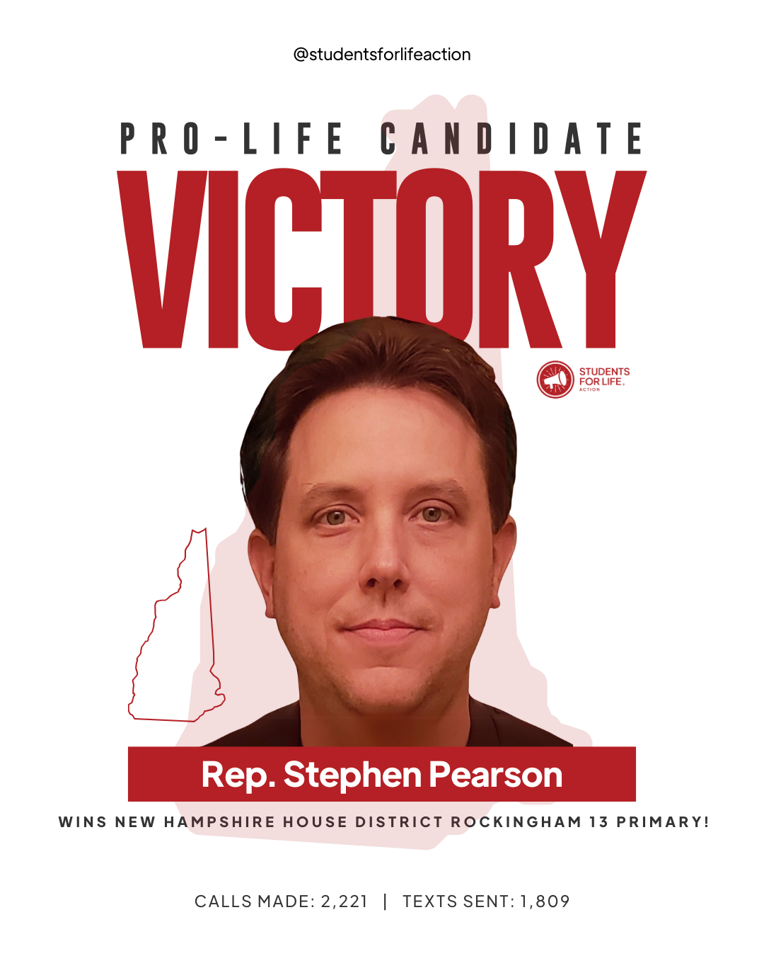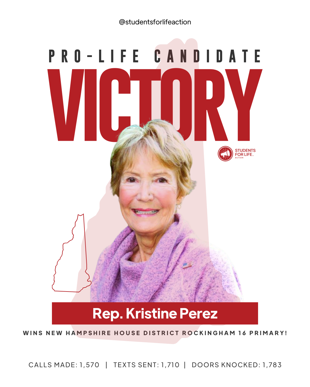CONCORD, NH (09-10-2024) – Students for Life Action (SFLAction) celebrates the election of six pro-life candidates and incumbents following New Hampshire’s state senate and house primary races. SFLAction Vice President of Political Affairs Chanel Jacobs said, “We achieved major victories in the ‘Live Free or Die’ state earlier this year by defeating two pro-abortion constitutional amendments, thanks to pro-life leaders in the legislature. Tonight, we’ve added six more to their ranks, ensuring a stronger defense against pro-abortion extremism in New Hampshire. In 2025, we’ll continue to expose pro-abortion extremists in both the Democratic and Republican parties, and our students will keep engaging lawmakers, advocating for new protections for women and preborn babies from dangerous Chemical Abortion Pills, which can cause injury, infertility, and even death.”