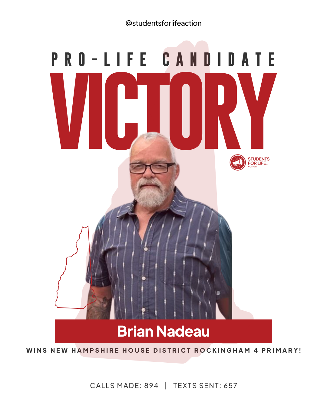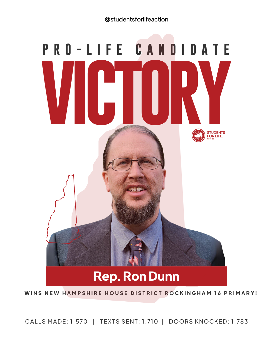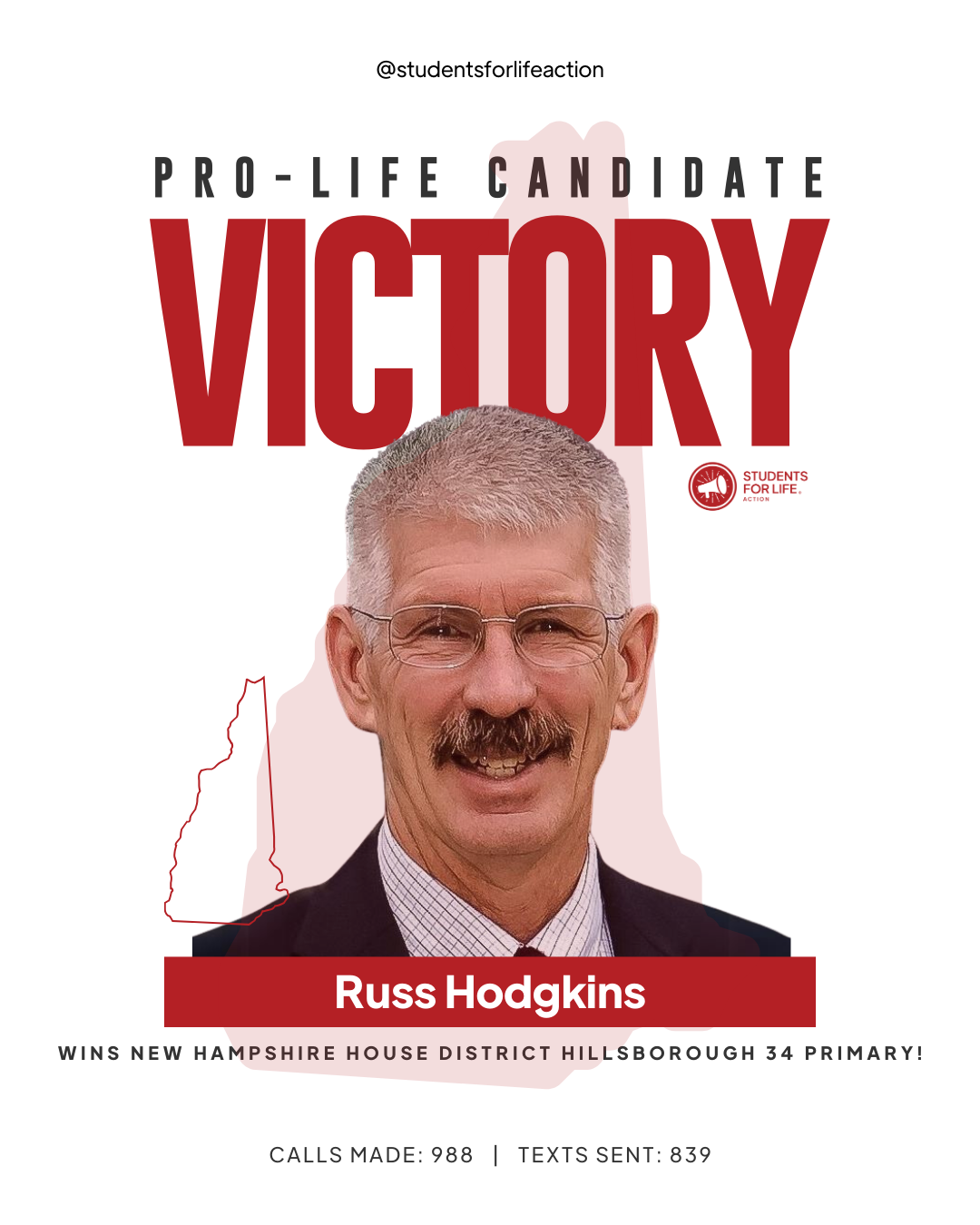 CONCORD, NH (09-10-2024) – Students for Life Action (SFLAction) celebrates the election of six pro-life candidates and incumbents following New Hampshire’s state senate and house primary races. SFLAction Vice President of Political Affairs Chanel Jacobs said, “We achieved major victories in the ‘Live Free or Die’ state earlier this year by defeating two pro-abortion constitutional amendments, thanks to pro-life leaders in the legislature. Tonight, we’ve added six more to their ranks, ensuring a stronger defense against pro-abortion extremism in New Hampshire. In 2025, we’ll continue to expose pro-abortion extremists in both the Democratic and Republican parties, and our students will keep engaging lawmakers, advocating for new protections for women and preborn babies from dangerous Chemical Abortion Pills, which can cause injury, infertility, and even death.”