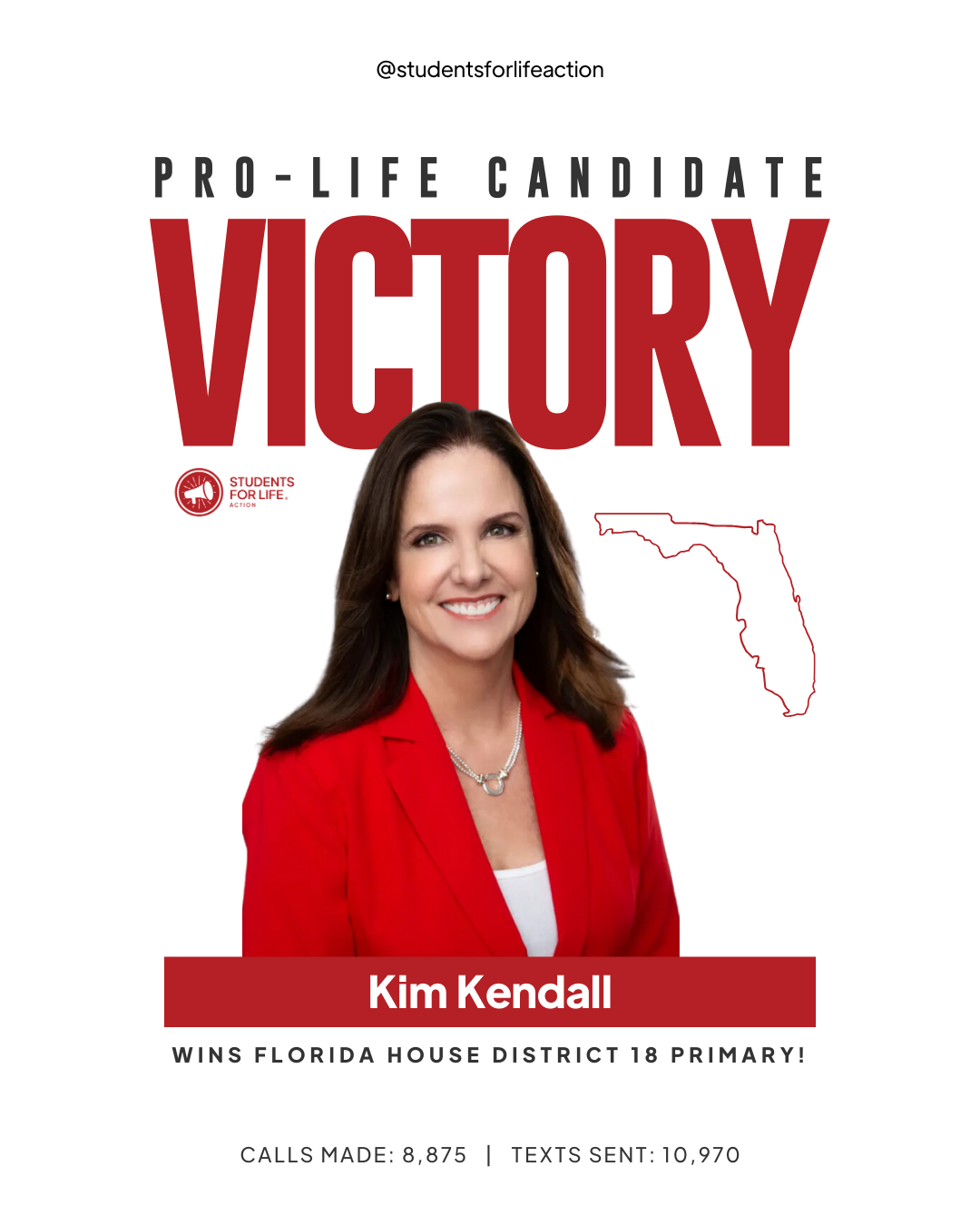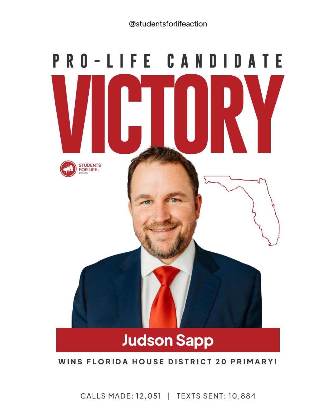 TALLAHASSEE (08-20-2024) – Students for Life Action (SFLAction) celebrates the election of two pro-life candidates and incumbents in the Florida senate and house primary races. Florida resident, SFLAction Vice President of Political Affairs Chanel Jacobs, said, “Florida faces one of the most important – and winnable – abortion ballot fights this November. Pro-life champion Gov. Ron DeSantis signed into law a bill that protects preborn life when the universal sign of life — a heartbeat – is confirmed. That humane law comes to an end if the radical abortion ballot measure succeeds in November. Tonight’s two primary winners will join those working to protect life in law and in service, standing up for mothers and preborn children in this election and in office.”