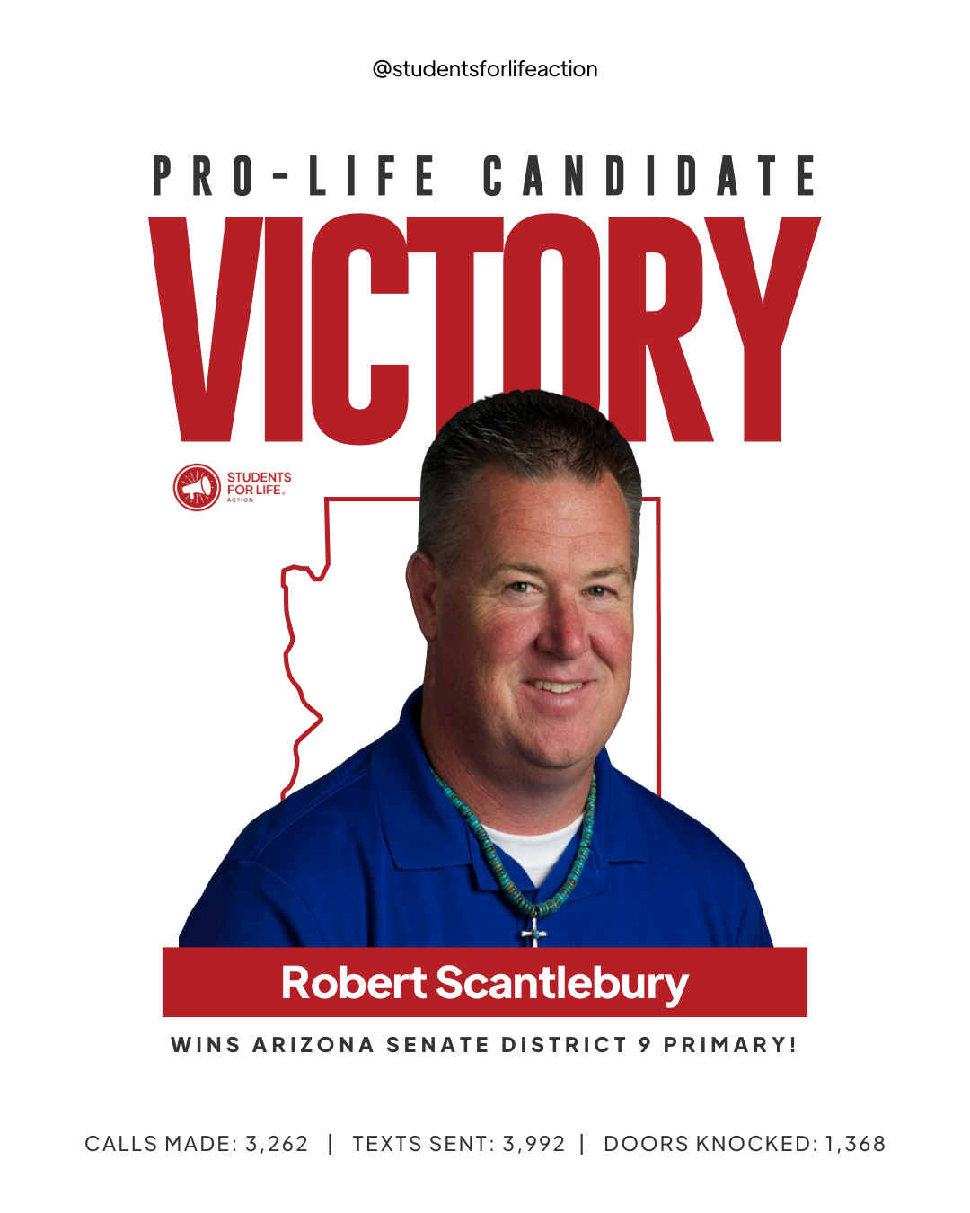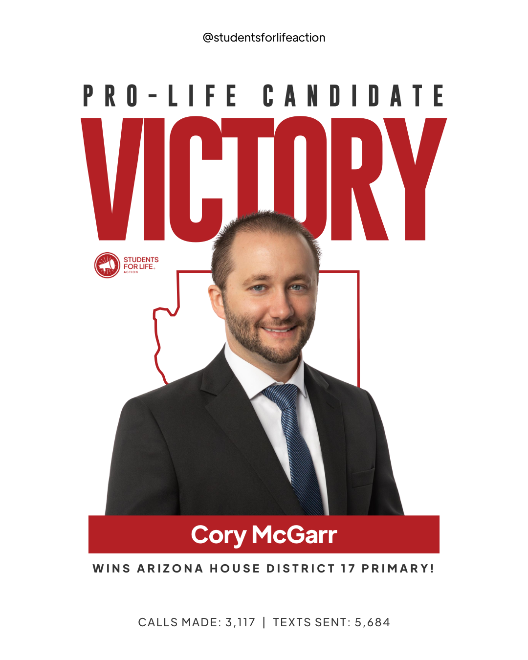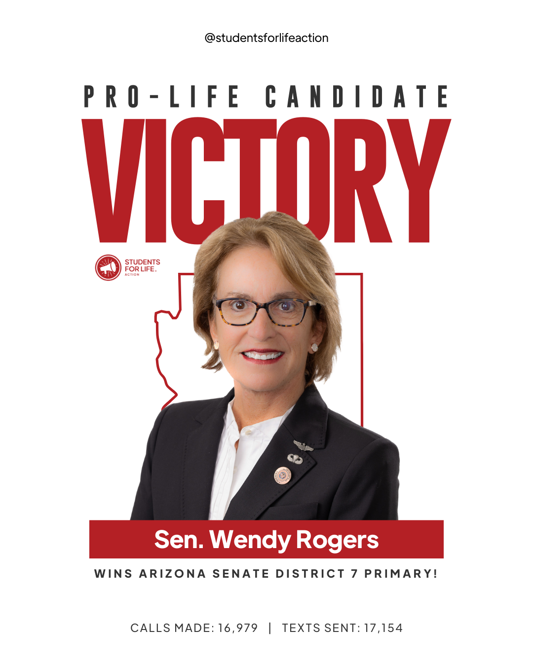 PHOENIX (07-30-2024) – Students for Life Action (SFLAction) celebrates the election of three pro-life candidates and incumbents after last night’s Arizona’s Senate and House primary races. SFLAction Vice President of Political Affairs Chanel Jacobs said, “Last night was a clear signal to pro-abortion Republicans that siding with radical abortion extremists in the Democratic Party to betray voter values will not be ignored.”